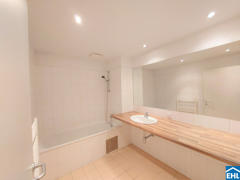 - modernes Bad mit Badewanne und Waschmaschinenanschluss