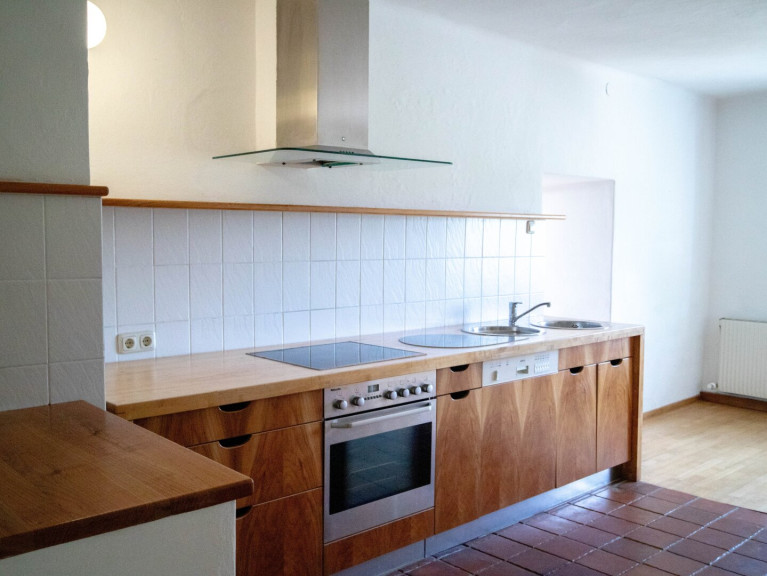 - Küche mit Ausgang auf die Terrasse und den Garten. Die Küche wurde massgefertigt und fügt sich sehr schön in den Raum ein