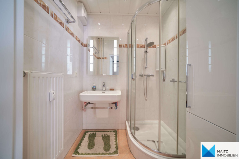 + Bad mit Dusche, beleuchtetem Spiegelschrank und Kasten