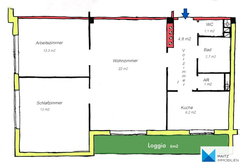 Der Grundriss erstreckt sich über 64m² zuzügl. 6m²-Loggia, bestehend aus: