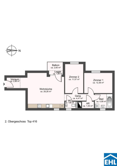 Die Wohnung selbst befindet sich im 2. Obergeschoss und verfügt über eine Wohnküche, zwei getrennt begehbare Schlafzimmer, ein Badezimmer mit Wanne und Waschmaschinenanschluss, eine separate Toilette sowie einen Abstellraum und einen Vorraum. Die Loggia und der Balkon rundet das Wohnerlebnis perfekt ab.
