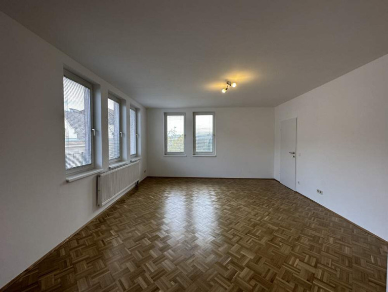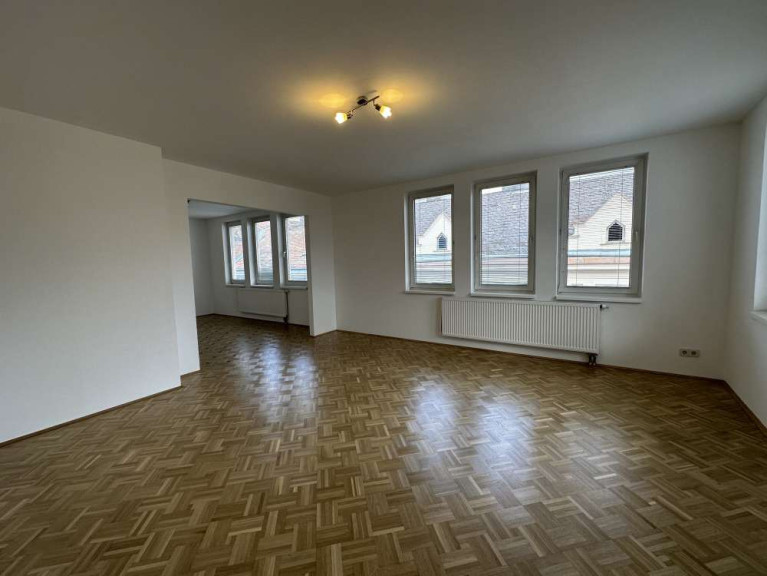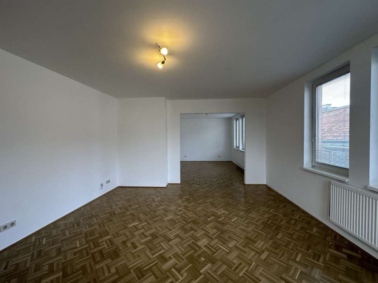 Ganz im Gegenzug zur Küche bietet das Wohnzimmer mit offenem Esszimmer überdurchschnittlich viel Licht. Dank der vielen, nach Osten und Süden ausgerichteten Fenster und dem erstklassigen Parkettboden sind diese beiden Räum überaus hell und freundlich. Vom Esszimmer aus gelangt man über einen kleinen Gang in das Schlafzimmer. Dieses ist ca. 15 m² groß und aufgrund der hofseitigen Lage sehr ruhig.