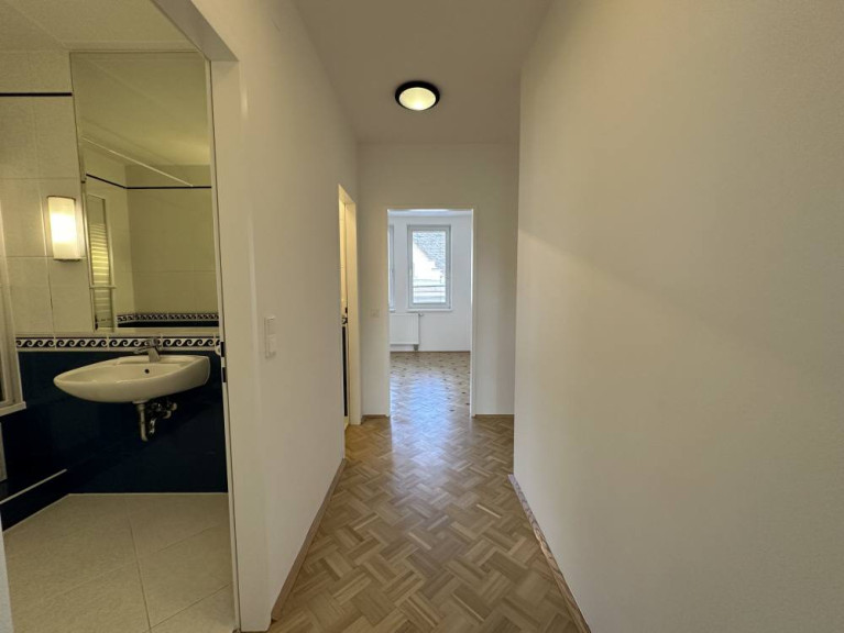 Das Vorzimmer ist bei dieser Wohnung nicht zentral angeordnet, sondern stellt lediglich die Verbindung zwischen Küche und dem Rest der Wohnung dar. Die mit einer Tischlerküche möblierte Küche bietet Ihnen alles, was Sie für den täglichen Gebrauch benötigen sowie eine große Arbeitsfläche.