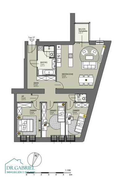 zentraler Vorraum, Wohnbereich mit offener Küche und Ausgang auf den Balkon, drei Schlafzimmer, Bad (Wanne, Dusche, WC, Waschmaschinenanschluss), Gäste-WC, Abstellraum