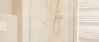 Der Vorraum verfügt hinter der Eingangstür über einen praktischen, großzügigen, abtrennbaren Abstellbereich sowie einen Waschmaschinenanschluss. Geradeaus geht es in der Badezimmer, welches einen geschmackvollen Waschtisch, eine verglaste Dusche, ein WC und einen Handtuchheizkörper bietet.