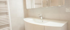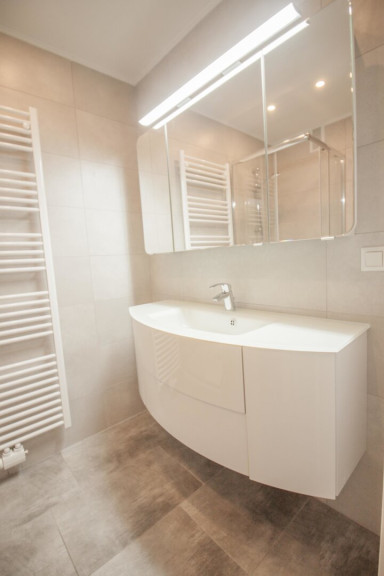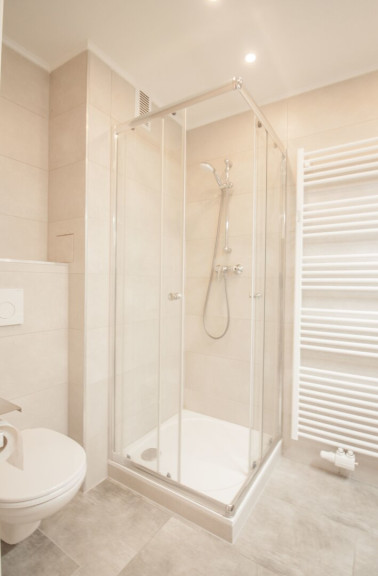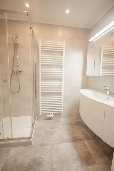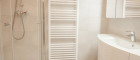 - Badezimmer mit WC, Waschtisch, Handtuchheizkörper & Dusche