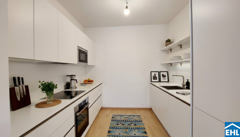 - Großzügige Wohnküche mit voll ausgestatteter Design-Einbauküche und direktem Zugang auf den Balkon