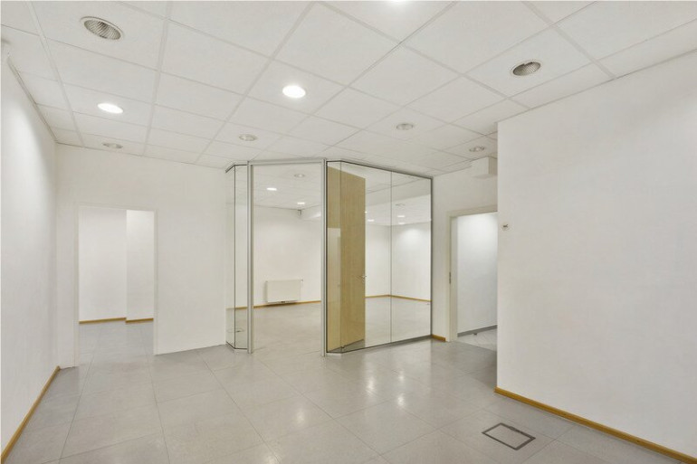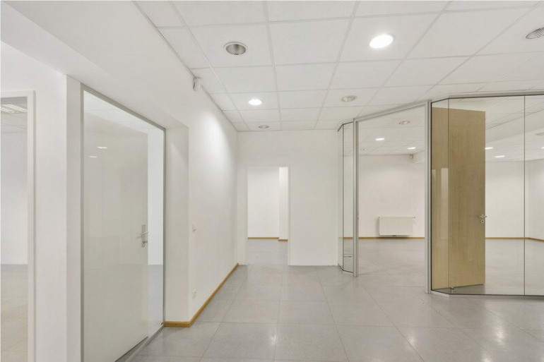 Zu Zeit bietet die Einheit mit knapp über 200m² einen unglaublich effizienten Grundriss mit 5 zentral begehbaren Büroräumen und einem verglasten Besprechungszimmer, wobei die Raumeinteilung ohne Probleme verändert werden kann.