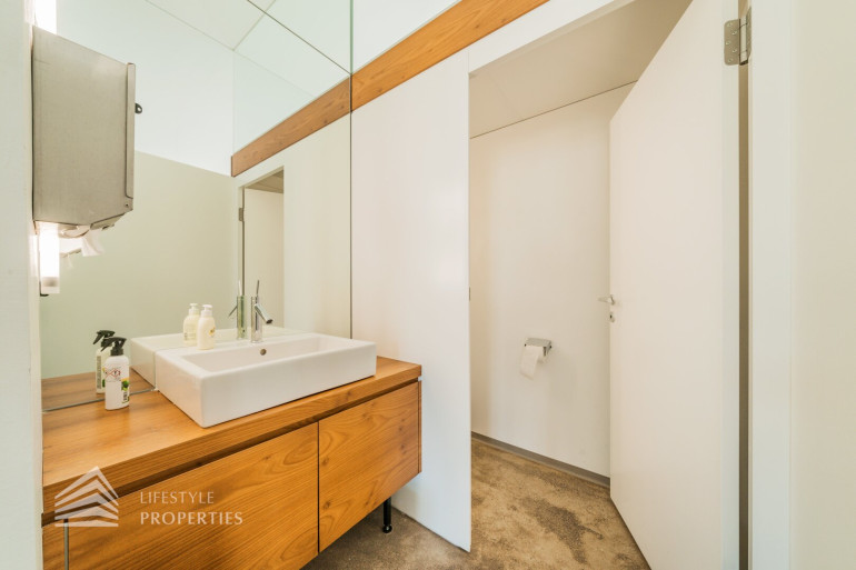 Aus dem großzügigen Vorraum gelangt man in den 1. großen Raum in welchem sich links genügend Platz für eine Ablagefläche/Aktenschränke oder anderes bietet. Rechts geht es in die weiteren Räume welche nacheinander angelegt sind und mit modernen Glaselementen getrennt wurden und so genügend Licht durchlassen. Die zwei Toiletten befinden sich in der Mitte. Die praktische Teeküche lässt sich direkt aus dem Vorraum betreten.