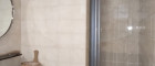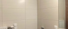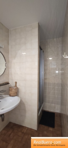 - Badezimmer mit Dusche, Handwaschbecken und Waschmaschinenanschluss