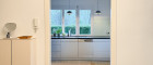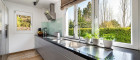 - helle, vollmöblierte Küche mit Blick ins Grüne