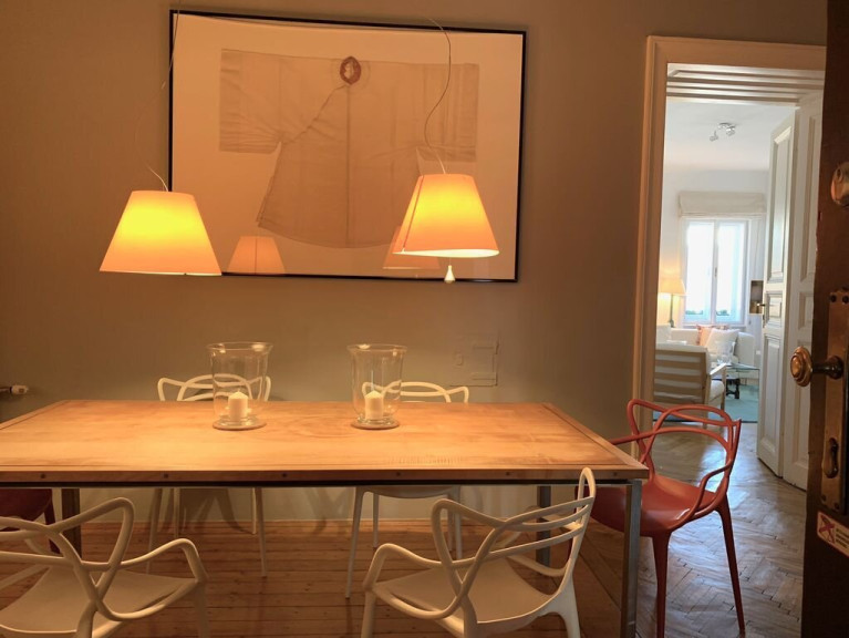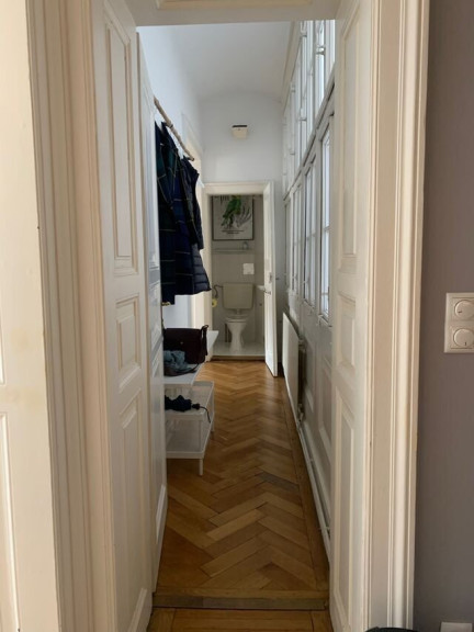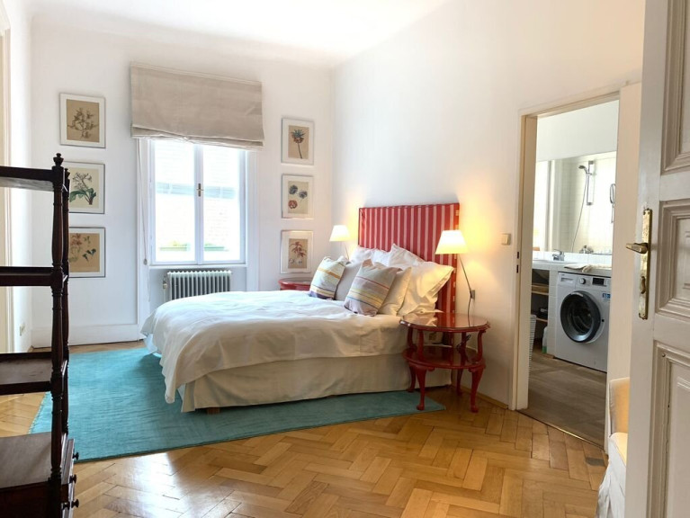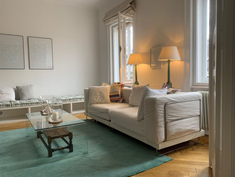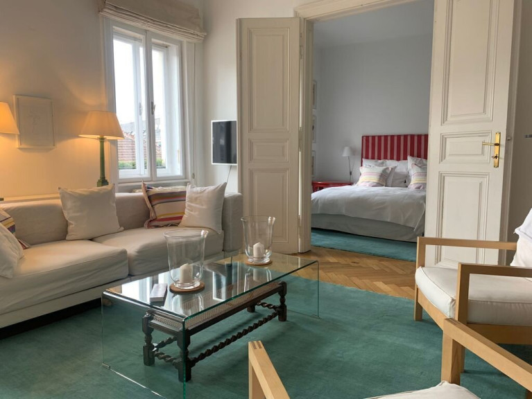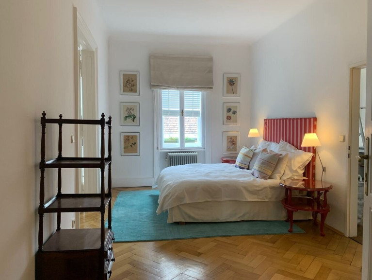 High ceilings, parquet flooring and a calm atmosphere give this apartment its special charm. The bright living room offers pleasant views over the surrounding rooftops, while the bedroom provides a quiet and comfortable retreat.