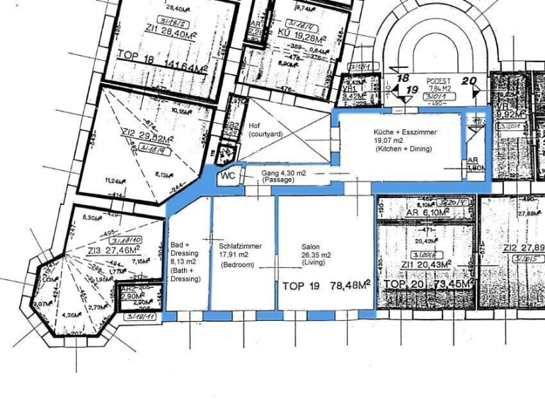 Hohe Räume, Parkettböden und eine ruhige Atmosphäre verleihen dieser Wohnung ihren besonderen Charme. Der helle Wohnsalon bietet einen freundlichen Blick über die umliegenden Dächer, das Schlafzimmer vermittelt ein angenehm ruhiges Wohngefühl.
