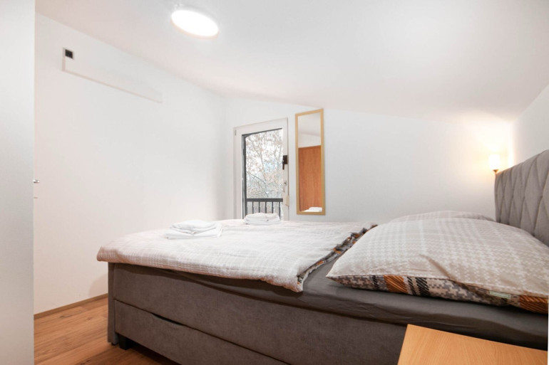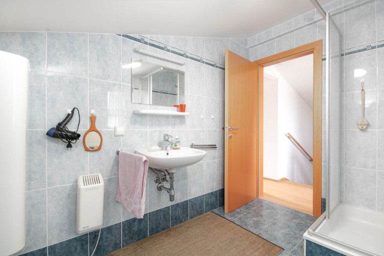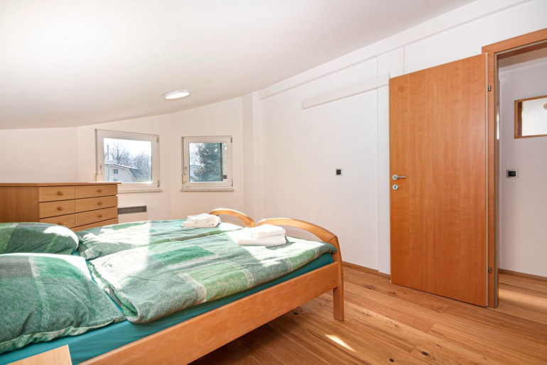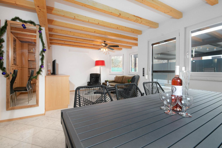 The bright living and dining area opens onto a covered terrace and provides a pleasant atmosphere. The kitchen is fully equipped and offers everything needed for daily living. On the upper floor you will find two comfortable bedrooms with good storage space. The house has one bathroom and two WC.