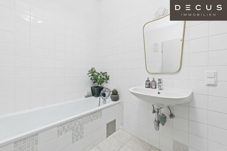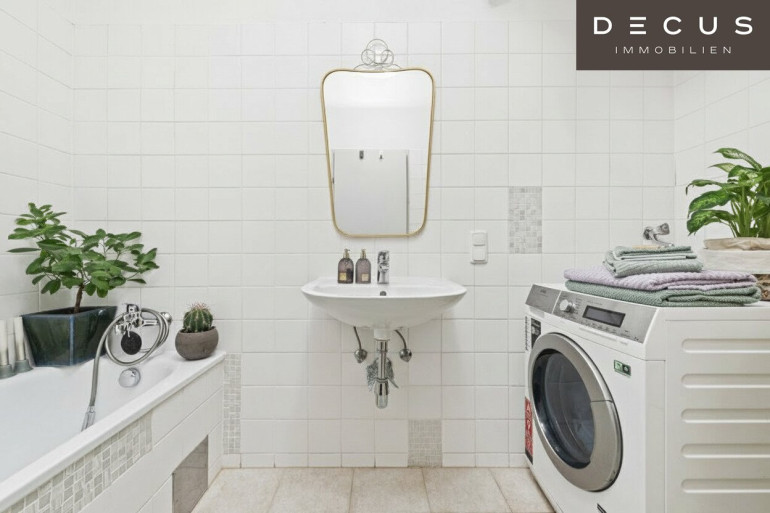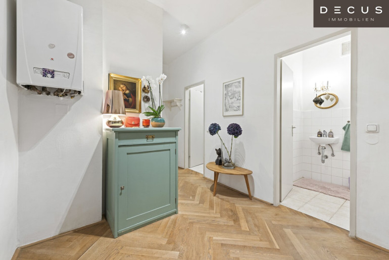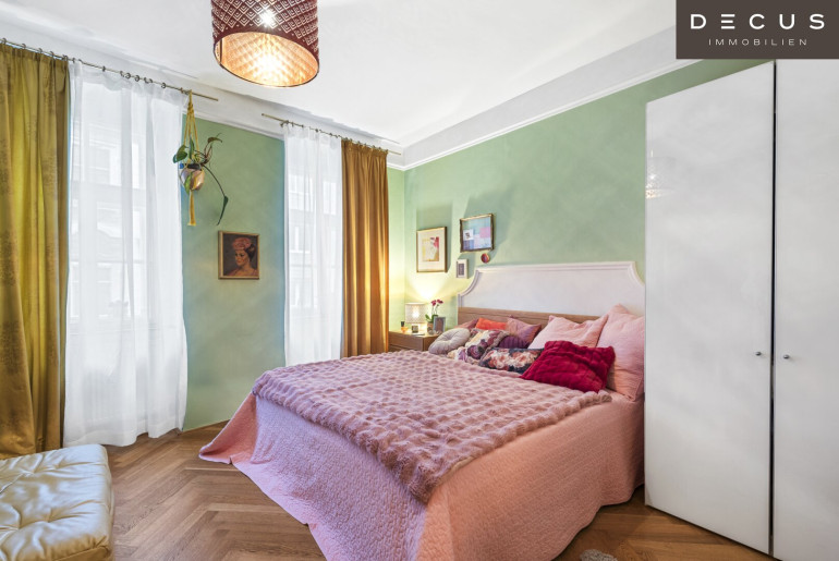 Zur Linken gelangen Sie in den privaten Bereich: eine separate Toilette, ein Badezimmer mit Badewanne, Waschmaschine und viel Stauraum. Am Ende des Ganges betreten Sie den 18 m² großen Schlafraum mit Stuckelementen. Der großzügige Raum bietet neben einem großen Doppelbett viel Platz für Kästen Kunst oder TV-Wände.
