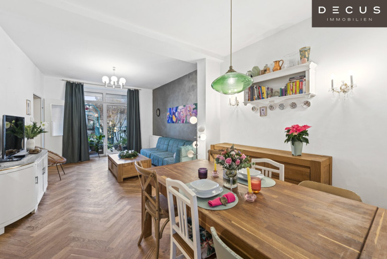 Morgens erhellt die Sonne die Räume über die Hermanngasse, am Nachmittag und Abend taucht das Licht vom Innenhof das Wohnzimmer in ein warmes, goldenes Leuchten – ein atmosphärischer Zauber, der den Charakter dieser Wohnung maßgeblich prägt.