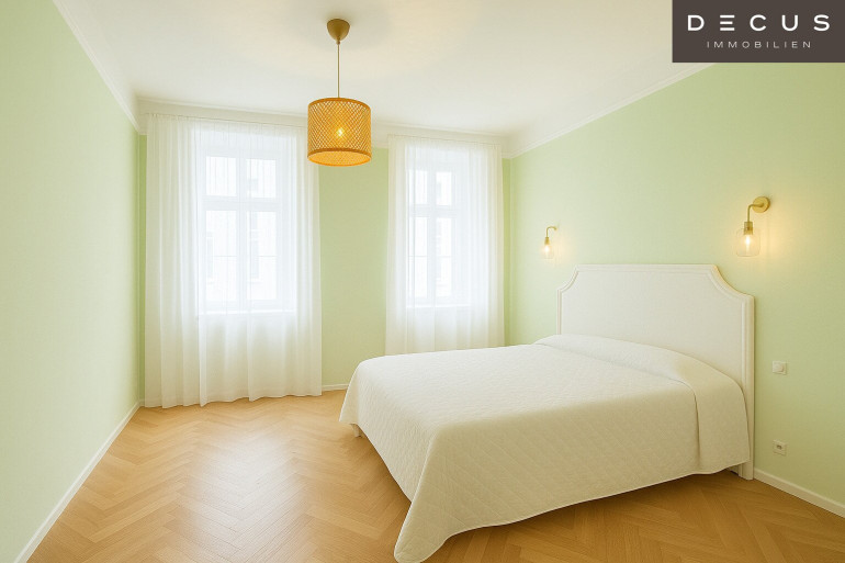 Das große Schlafzimmer ist ruhig, behaglich, und hat zwei Fenstern zur verkehrsberuhigten Hermanngasse.