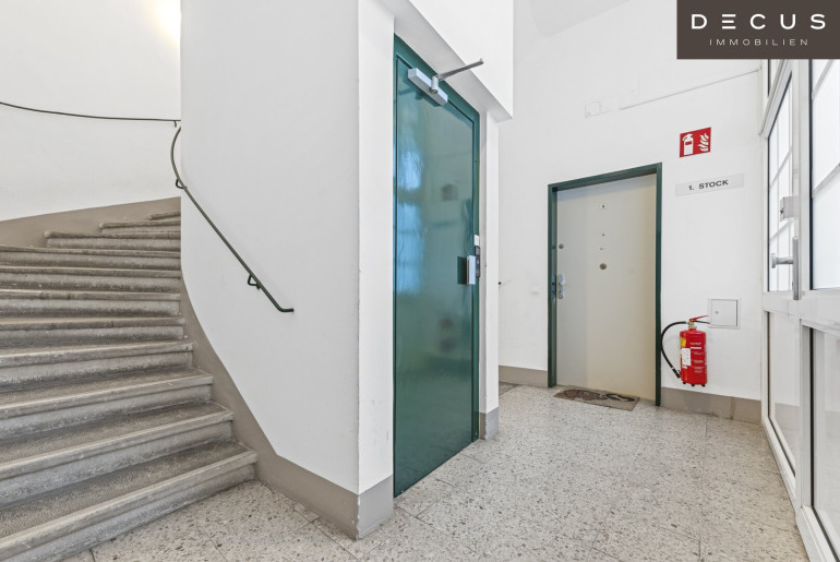 Der Zugang erfolgt bequem über das Stiegenhaus oder einen Lift, der das Apartment barrierefrei erschließt (Hinweis: Lift 69 cm breit / 100 cm tief; am Eingang wird eine kleine Stufe über eine Rampe überwunden).