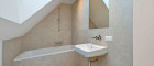 Badezimmer mit Badewanne, Fenster und Waschmaschinenanschluss