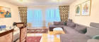 Wohnzimmer eingerichtet; langer Tisch mit sechs gemütlichen Sesseln sowie eine große Couch;