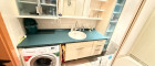 großes Badezimmer mit Badewanne, Spiegelschrank, Waschbecken und WC sowie einer Waschmaschine;