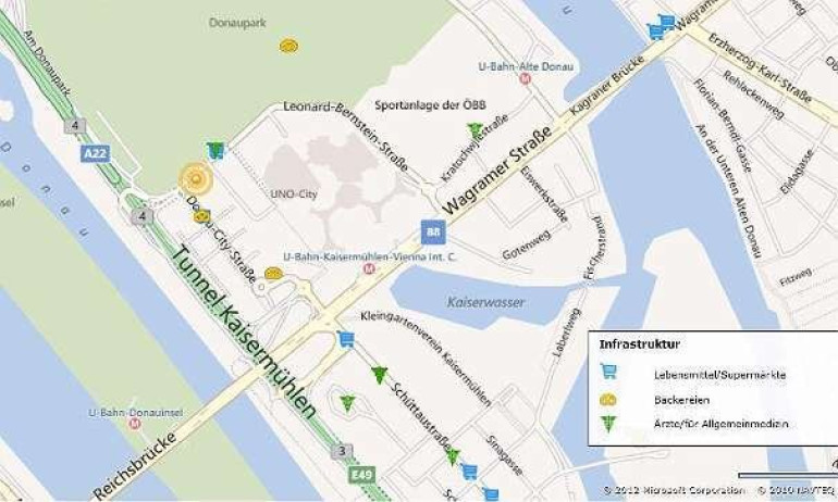 U-Bahn- und Straßenbahnhaltestellen sind nach kurzer Zeit erreichbar, die nächste Autobahnanschlussstelle Reichsbrücke ist in unmittelbarer Entfernung und auch direkt von der Garage erreichbar. Die U-Bahnstation Kaisermühlen liegt nur 5 Minuten zu Fuß entfernt. Von der Wohnung aus brauchen Sie ca. 8 Minuten mit der U-Bahn zum historischen Zentrum / U1 (Kaisermühlen, VIC); Autobuslinien Linie 91A, 20B / Nur wenige Minuten entfernt liegt die bekannte UNO-City und das VIC - fußläufig sehr gut und schnell erreichbar (ca. 2min), das Donauzentrum & Donauplex sowie die Vienna International School. Die Wohnung liegt direkt an den Erholungsgebieten Donaupark, Alte Donau und der Donauinsel; DerDonaupark liegt direkt davor. Die Alte Donau, Donauzentrum/ Donauplex, Segelschule, Sportcenter, Donaucity, Gänsehäufel, Strandbad, Alte Donau, etc.alles in der Nähe. Zahlreiche Gastronomiebetriebe, Supermärkte, Ärzte, Bäckerei, Bankfilialen, Büros, Billa, Bank, Postamt, Hofer, etc. befinden sich direkt am Standort Donau City. Kindergarten, Volksschule, Gymnasium, Vienna International School; Praktischer Arzt, Apotheke Donauzentrum. Der Donaupark liegt direkt vor der Tür; Segelschule;, Cineplexx Kino; Sportcenter, Donaucity; Albert-Schultz Eishalle (Attemgasse); Strandbad Alte Donau. Zum Donauzentrum / Donauplex, Segelschule, Sportcenter, Donaucity, Gänsehäufel, Strandbad, Alte Donau etc. sind es nur ein paar Gehminuten.