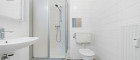 Das Badezimmer ist mit Dusche, Waschbecken, Spiegelschrank und WC ausgestattet.