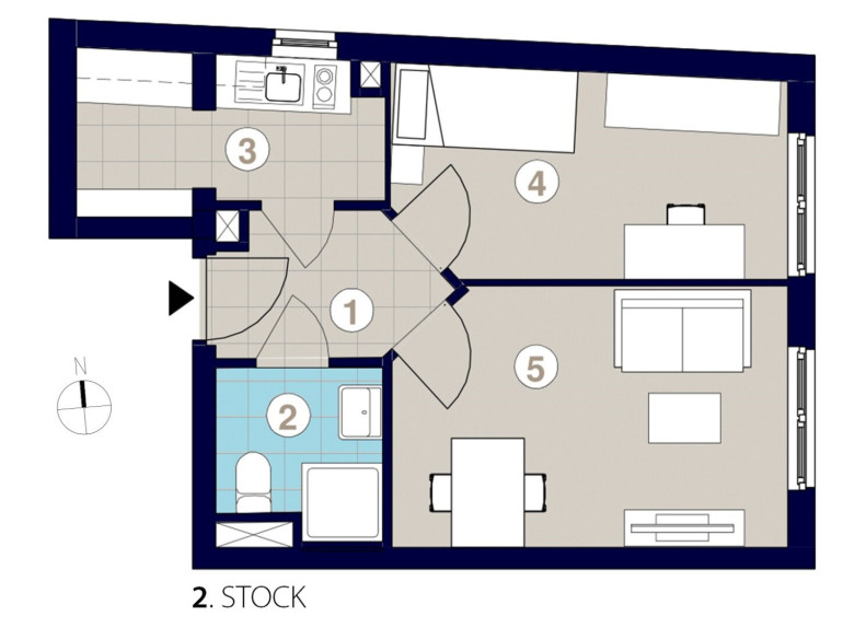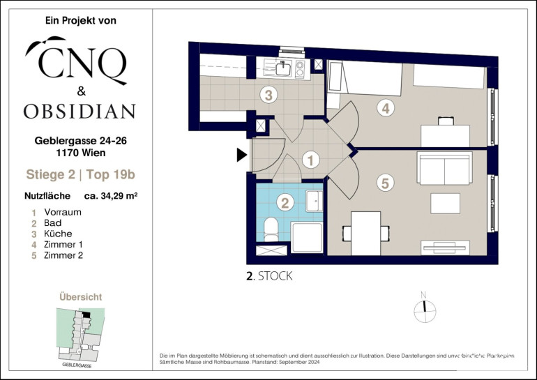 Diese charmante ostseitige Eigentumswohnung befindet sich im 2. Liftstock eines Neubaus und bietet auf ca. 34,29 m² eine durchdachte Raumaufteilung. Sämtliche Räume sind zentral vom Vorzimmer aus begehbar: