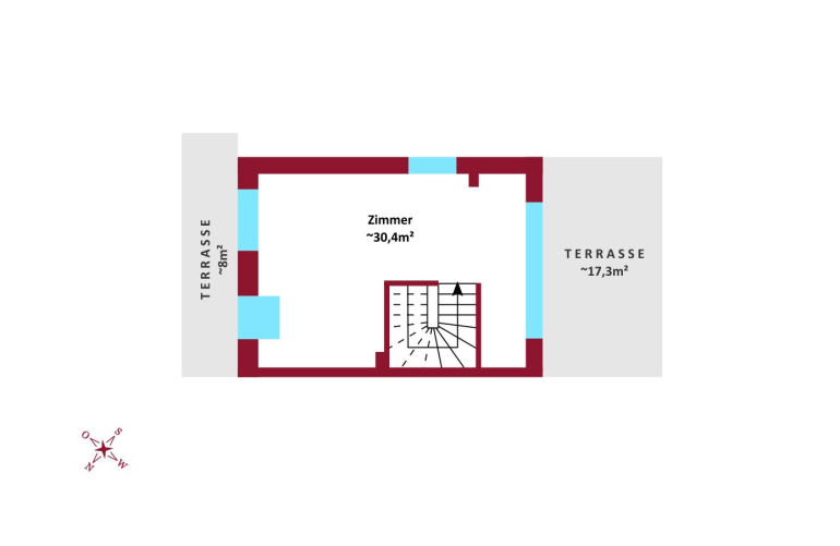 - Zimmer: ca. 30,35 m² mit Zugang zur Terrasse 1 mit ca. 8,03 m² und Terrasse 2 mit ca. 17,34 m²