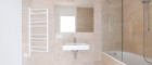 Das Badezimmer besticht durch zeitloses Design und verfügt über eine Badewanne inklusive Duschwand, Toilette, Handtuchheizung, Waschbecken und Waschmaschinenanschluss.
