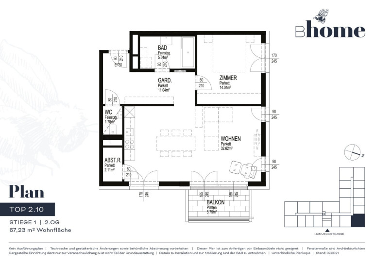 Diese optimal aufgeteilte, ca. 67,23m² große Wohnung befindet sich im 2. Obergeschoß eines modernen Wohngebäudes und ist sowohl barrierefrei mittels Lift als auch über das Stiegenhaus erreichbar.