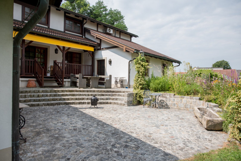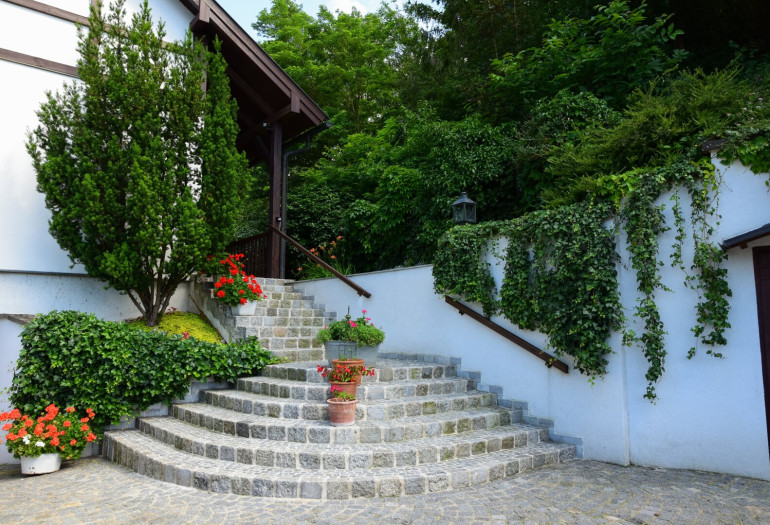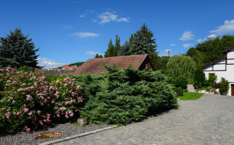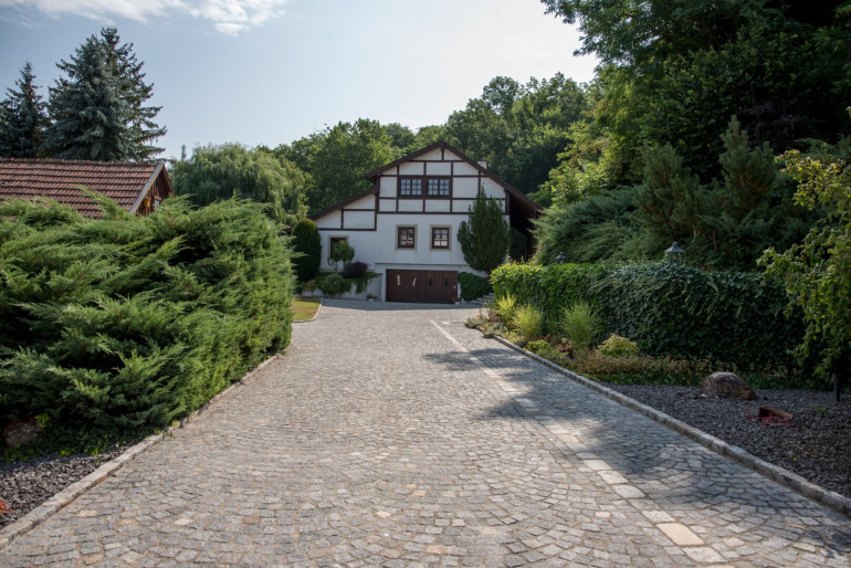 - Großzügige Einfahrt mit Granitpflastersteinen und einer Garage.